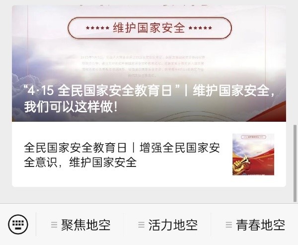 公司微信公众号发布《“4·15 全民国家安全教育日”|维护国家安全,我们可以这样做!》《全民国家安全教育日|增强全民国家安全意识,维护国家安全》专题推文,广泛宣传全民国家安全教育日,动员师生参与网络安全大赛(CTF竞赛)线上答题活动。同时,公司张贴国家安全教育日系列海报,集中展示全民国家安全教育日内容。