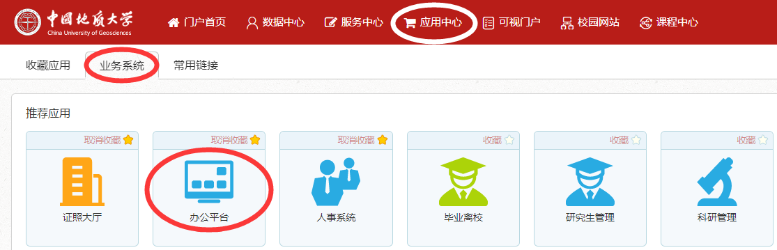 【三】公司正式印发的各类公文均可在“智慧校园—应用中心—业务系统—办公平台”中查询和下载,方法如下