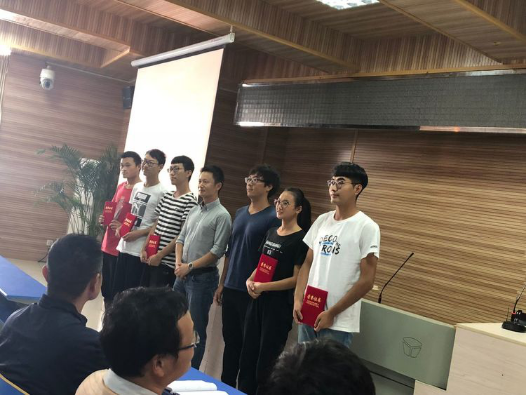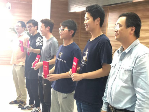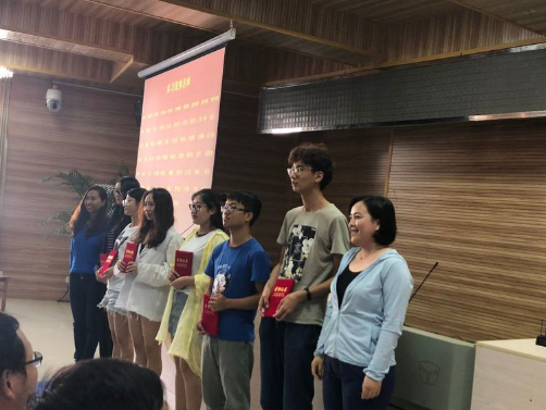 杨宝忠老师和汪利民老师在给李四光班优秀员工颁奖