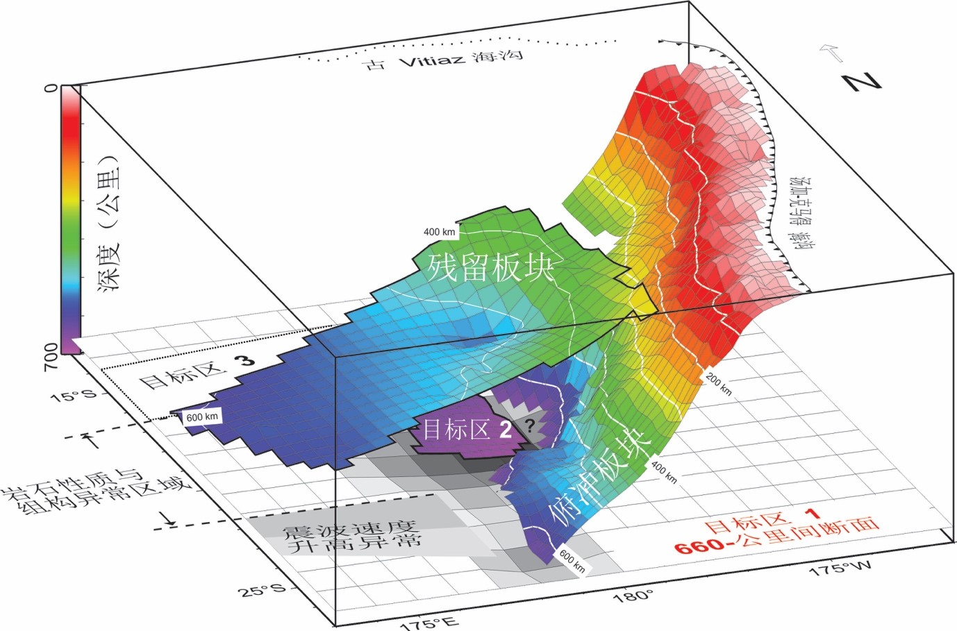 根据深震分布及地震节面解而描绘的汤加-克马得俯冲带三维图。图中标示了本项目在地球深部的科学目标区域。(根据Chen & Brudzinski [2003]改画)。
