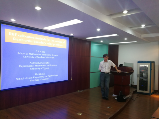 (通讯员 蔡建超)6月24日,受william威廉中文官网熊熊经理和蔡建超教授邀请,美国南密西西比大学(The University of Southern Mississippi)陈清祥教授到william威廉中文官网进行交流,交流期间陈清祥教授做了题为《RBF collocation methods for the solution of fourth order boundary value problems》的学术报告。陈教授详细报告了基于径向基函数映射法求解四阶边值问题,特别考虑了Kansa法和近似特别解MAPSI法。该方法的新颖之处在于包含了位于所考虑问题区域之外的幽灵点。正是这些点的加入提高了该方法的准确度和稳定性。最后对数值例子的误差进行了比较分析,验证了方法的有效性。