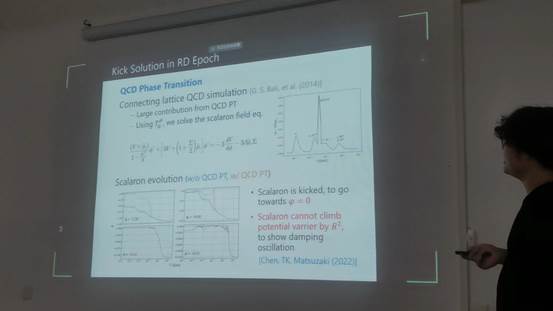 桂川副教授首先对修正引力的必要性进行分析和阐述,随后证明了F(R)理论和标量-张量引力理论的等价性,并引入了一种标量子的新粒子,用标量子构造一个符合当今宇宙学观测的暗能量和暗物质模型。此外,该理论还成功的解释了变色龙机制。最后,桂川大志副教授讨论了该模型下的早期宇宙演化和高能粒子形成的相关过程。