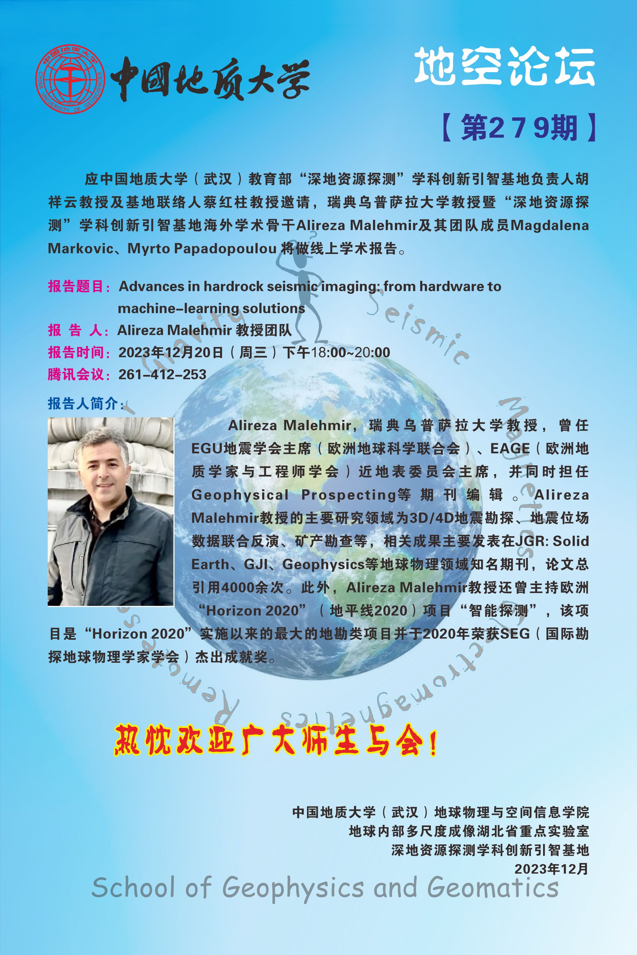 地空论坛【第279期】瑞典乌普萨拉大学教授暨“深地资源探测”学科创新引智基地海外学术骨干 Alireza Malehmir 教授团队